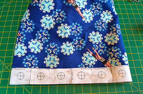 - Find the Grommet Placement Template. Place it in position around the top of the bag. The Template has guide lines for the center front and the back seam so it’s easy to align correctly. Pin the template in place.