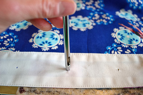 - Using a fabric pen or pencil, push the tip through each hole all the way around the top of the bag to mark the center point of all twelve grommets.