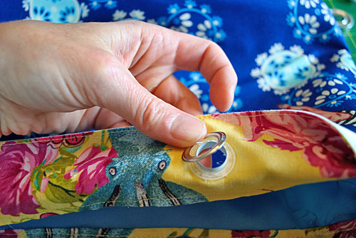 - Find the assembled bag. Slip the grommet panel loop over the top of the bag. The top raw edge of the grommet panel loop should be flush with the top raw edges of the bag. Align the grommet loop’s seam with the bag’s center back seam.