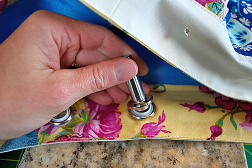 - Repeat to set all twelve grommets. If you are brand new to working with grommets, you can check out our full tutorial on How to Insert Metal Grommets.