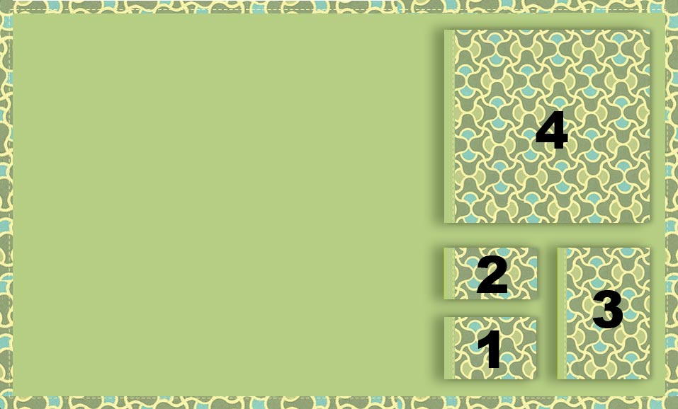 - Lay pocket #2 on the base fabric about 1½” above pocket #3 and ½” to the right of pocket #1. Pin and stitch as indicated above in steps 13-15.