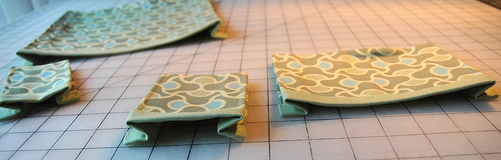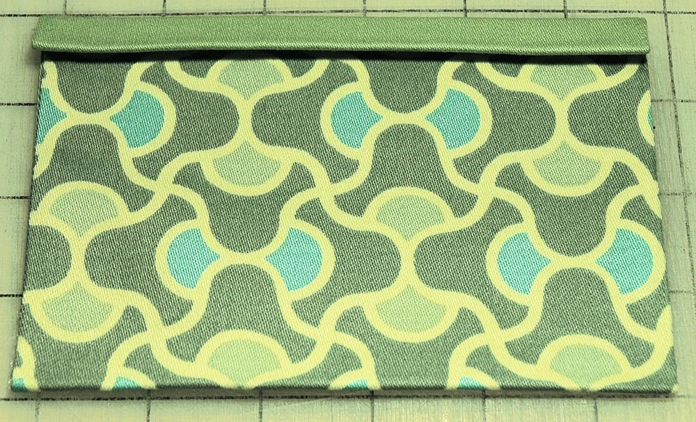 - All the pockets have side gussets for expansion and an inside lining for stability. The lining fabric folds over the top to mimic binding. This means 3½” must be added to the finished width and ¼” to the finished height for the outside or printed fabric. And, 3½” must be added to the finished width and 1¼” to the finished height for the inside or solid fabric.