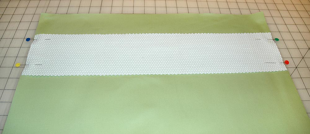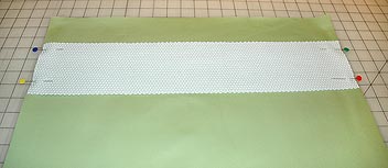 - Place the 20″ x 4″ gripper fabric against the back side of the base fabric, positioning it 4″ from top edge and edge-to-edge across the width. Pin.