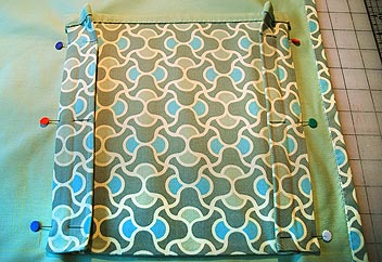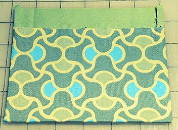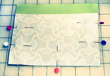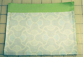 - Lay out all your printed and solid pocket pairs with right sides together. Line up the bottom edges of the solid and printed fabrics. The top edge of the solid fabric should extend 1″ above the top edge of the printed fabric.