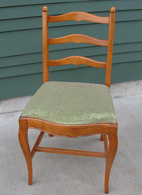 - First step: find your chair. Ours belonged to a family member and had put in a lot of good years as part of a vanity set. The chair itself was in pretty good shape, but the fabric was shot.