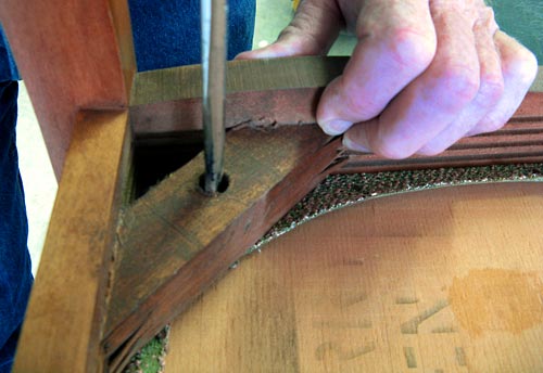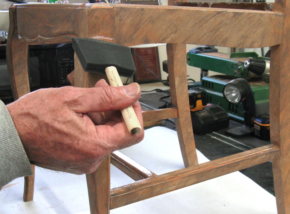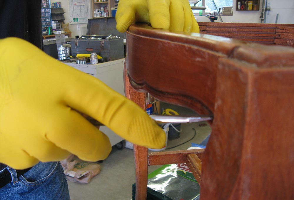 - A small brush like an old toothbrush can be helpful to coax stripper and finish from a tight spot. We used the tip of a screwdriver to carefully peel varnish out of some of the carved areas.