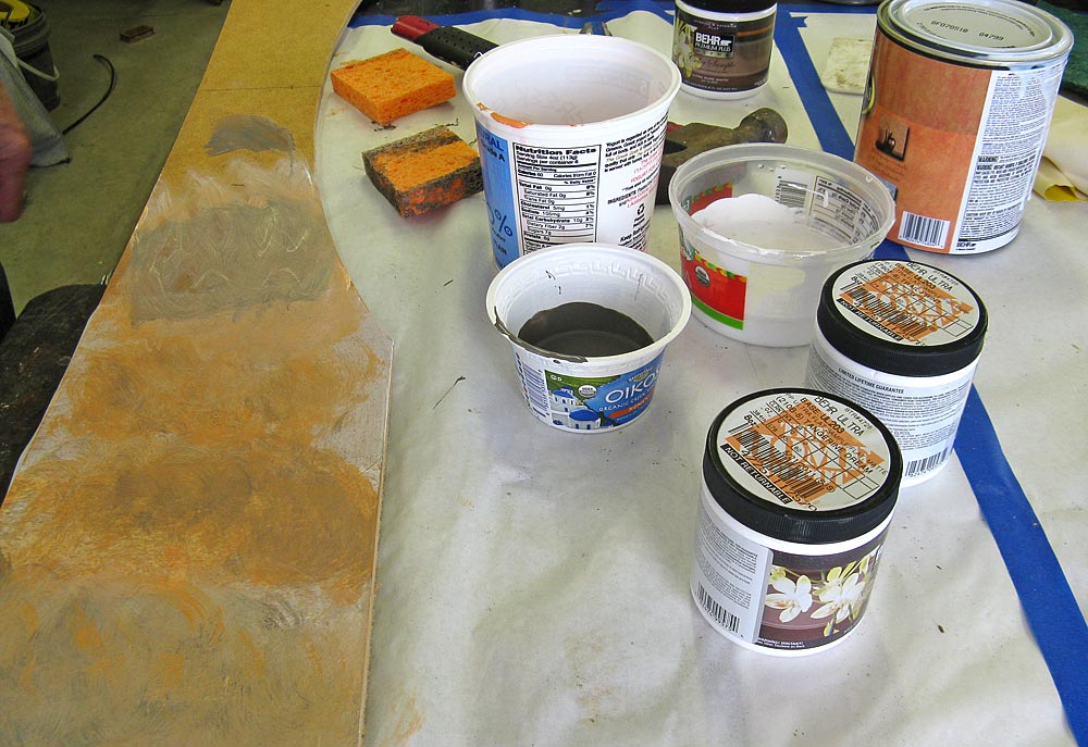 - Our glazing required a ratio of one part glaze to four parts paint. We just eyeballed it, using some small containers we had on hand from the recycling bin. The household sponges were cut in half and a fresh one used for each color.