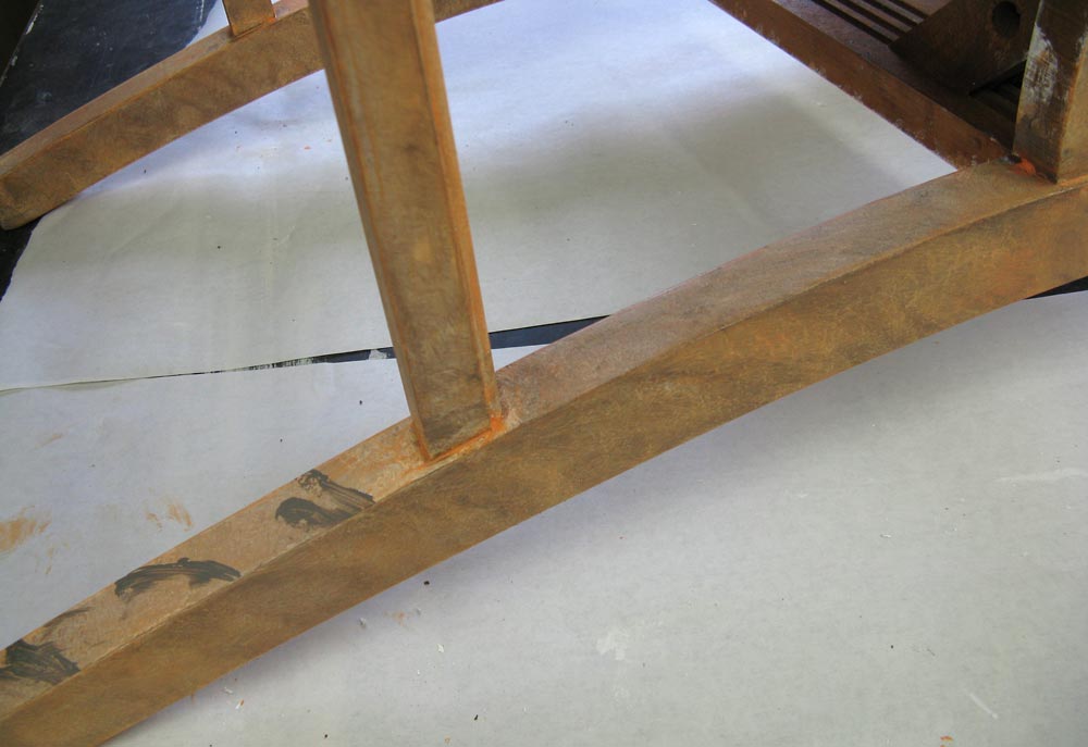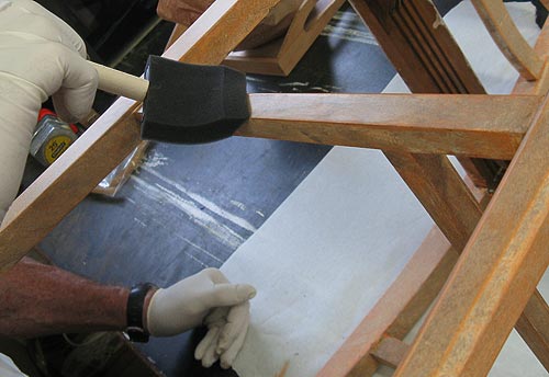 - Be sure you are in a well-ventilated area. Outside is best. This stuff stinks, and the fumes are not something you want hanging around. Give the chair a thick coat that lays on the surface. There’s no need to brush it in like paint… simply apply in one direction, making sure you get into the tight areas. Do not keep going back over the application; the stripper forms a film that helps keep it from drying out. Let the stripper stand for about 30 minutes (follow the manufacturer’s direction for your stripper), then test an area with a plastic scraper to see how much finish comes off. If it needs more time, let it go, but don’t leave it on more than an hour or so….you don’t want the stripper to completely dry.