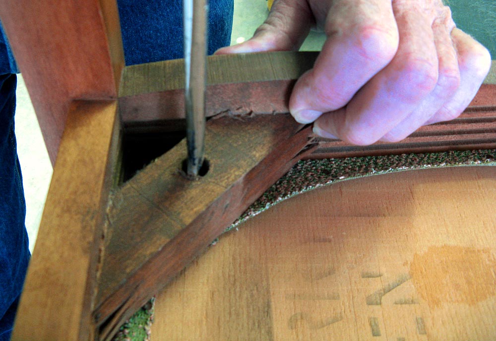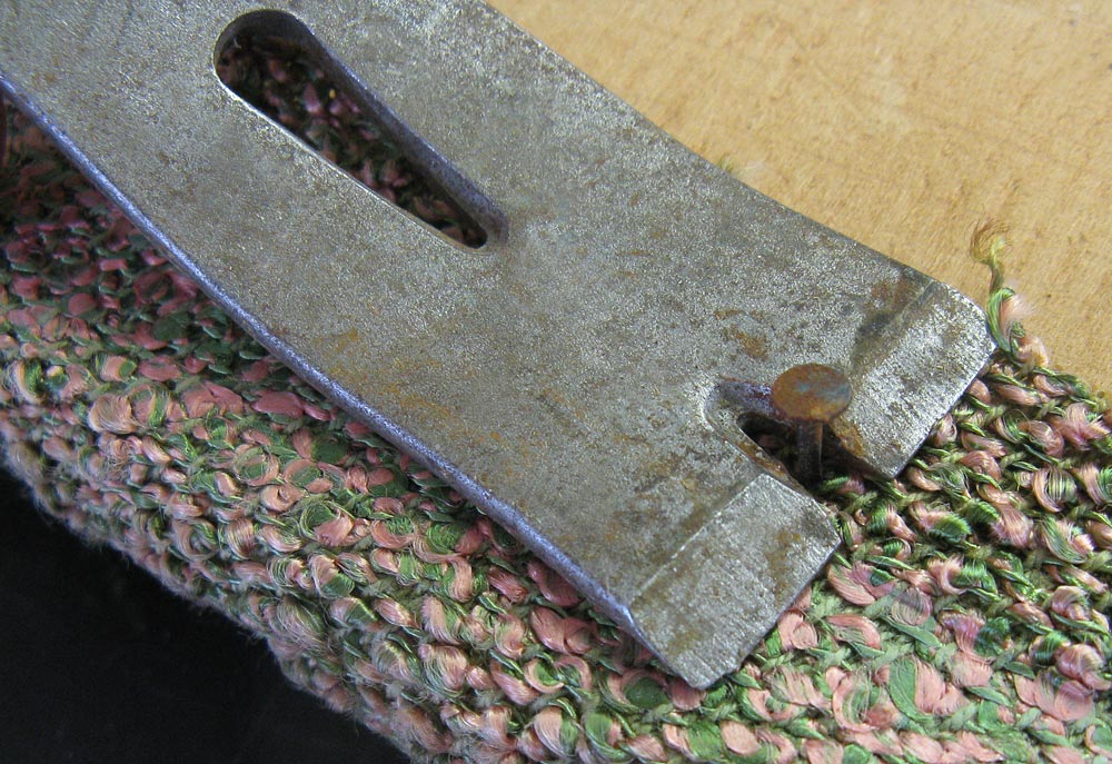 - Our old covering was held in place with tiny upholstery tacks. A mini pry bar was perfect for popping these out. You could also use a flat head screwdriver, but the pry bar is better and safer. You can often find these in the impulse section at your local home improvement store’s check out counter.