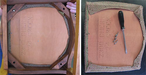 - Remember those screws you kept track of? Find them now and screw the new cushion into place. It’s a good idea to make a small slit or hole in your fabric at each screw hole. By doing this, driving the screws into place won’t pull or distort your nice new cushion.