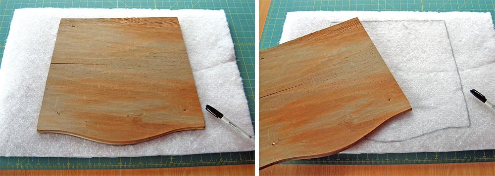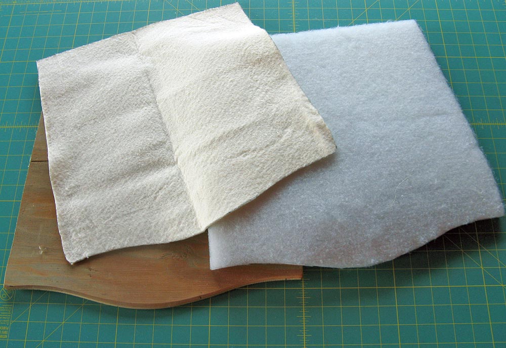 - Layer the NuFoam and batting onto the wooden seat.