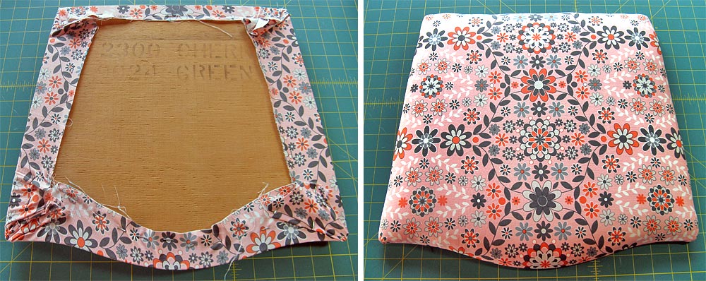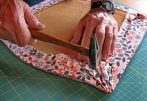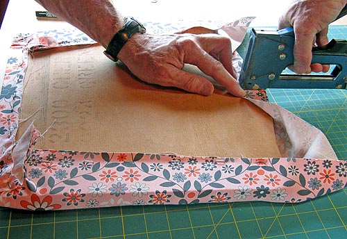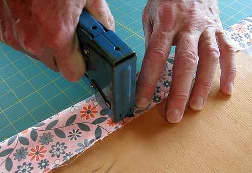 - Wrap one side to the back and tack it in place with the staple gun. (You could use upholstery tacks, but they are quite a bit harder to manipulate.) Your wrap should be snug and taut, but not so tight you distort the fabric or flatten the cushion.