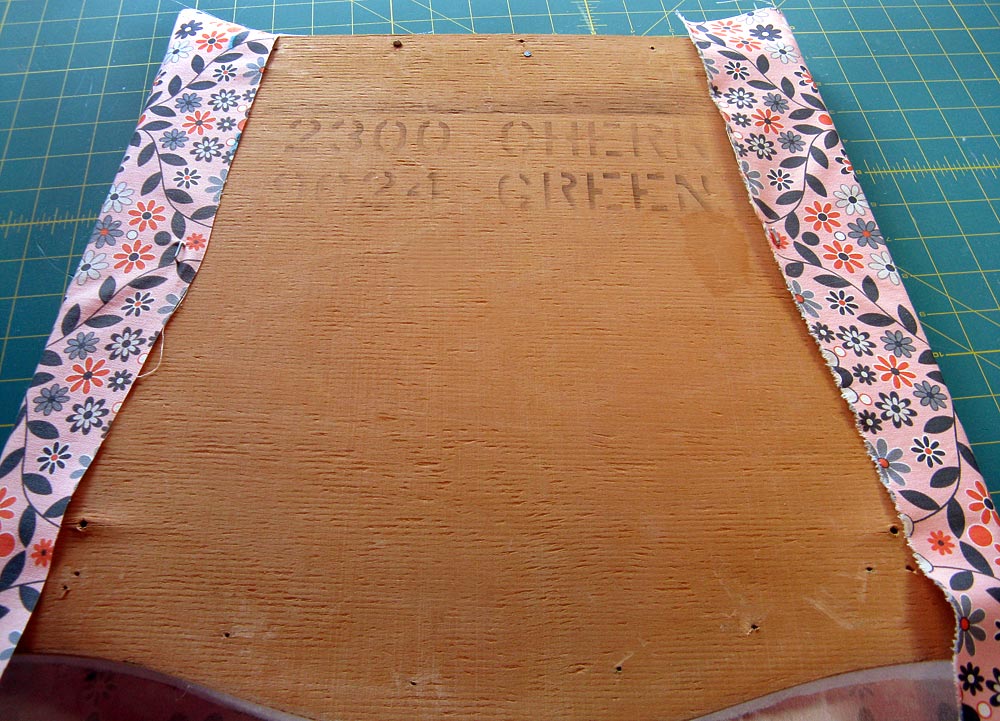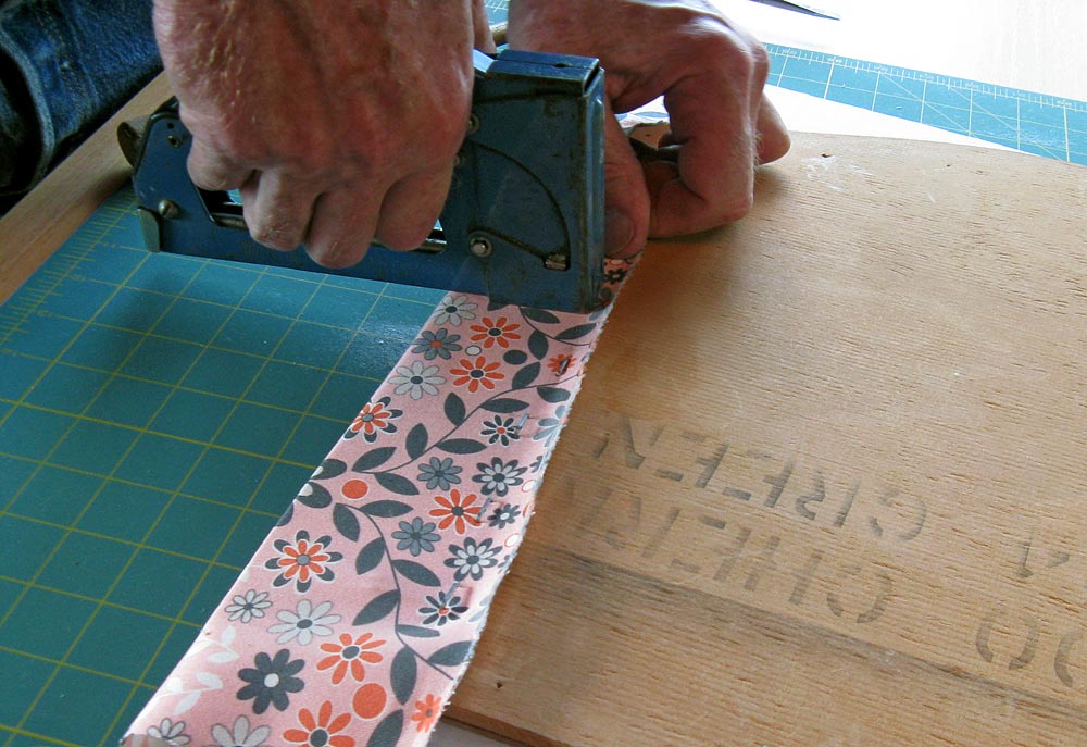 NOTE: If you think your motif has shifted, remove the two initial staple tacks and re-wrap. Take the time to be really sure everything looks good, because taking a bunch of staples out of old wood is not fun. - Repeat to wrap the top edge of the seat and then the bottom edge.