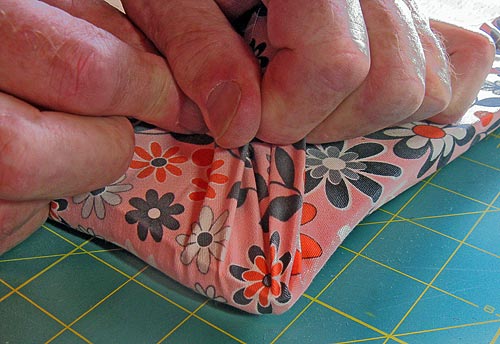 - Finally, pull the fabric around each corner. This takes a little futzing, but is not hard. Gather the corner fabric and pull back against the wood; you want to be able to see the edge of the seat so you can work along it. Adjust the gathers as you pull until they are even.