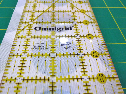- With a see-through ruler, measure 2½” in from the point of the corner peak, and draw a line. Repeat on the opposite corner.