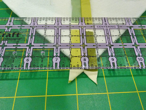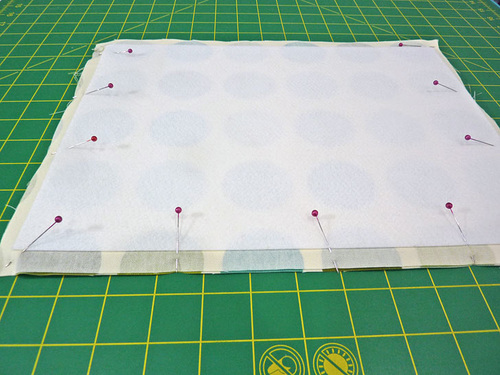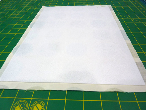 - Center the interfacing on the wrong side of each fabric panel so there is ½” of fabric showing beyond the interfacing on all sides.