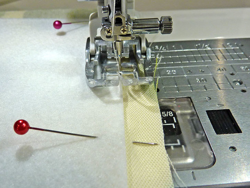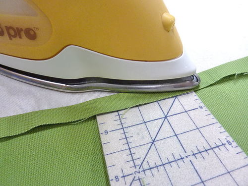 - Find the 4″ x 30″ handle sleeve strip. Fold it in half lengthwise so it is now 2″ x 30″. Pin in place along the 30″ side.