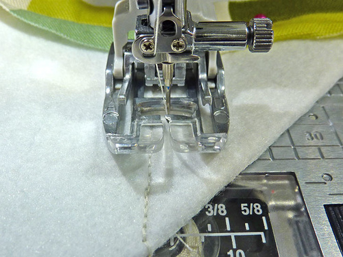 - Pin in place and stitch along the drawn line. Stitch a second line approximately ⅛ from the first seam for stabilization and security. Repeat on the opposite corner.
