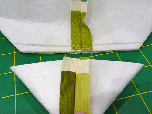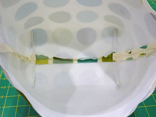 - Find the handle. Slip one end of the handle in between the lining and the exterior layers at each side seam. The handle ends should be inserted down about ½”.