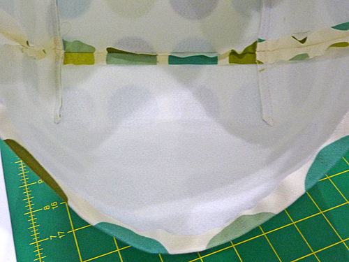 NOTE: You can, of course, finish the ends of your ruffle with your favorite method, overlapping as described or seaming as you would a binding. If overlapping, consider hand stitching a short vertical seam to keep the ends together. - Machine baste the ruffle strip in place all around the top of the exterior basket.