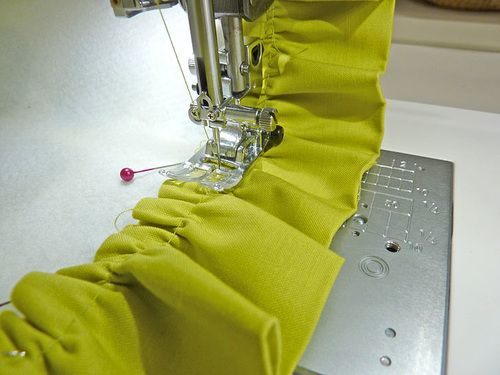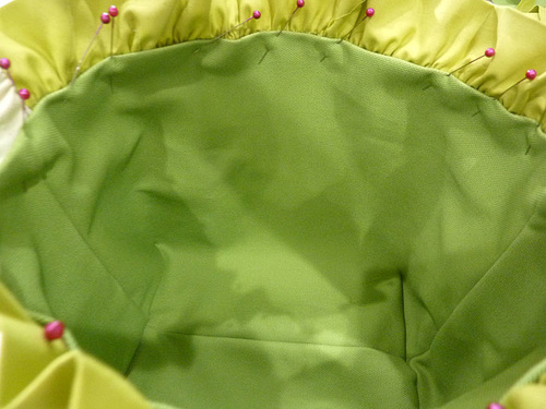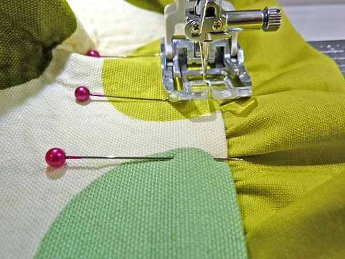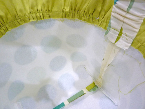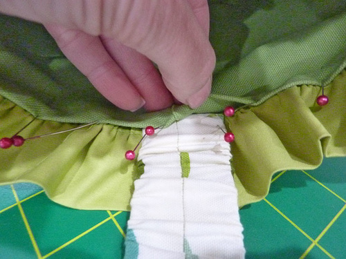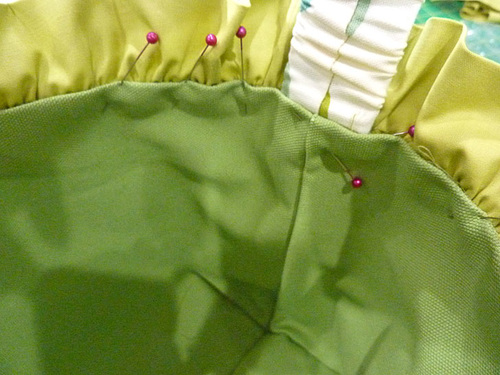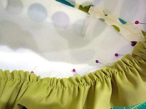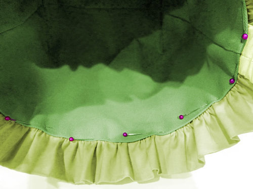 - Starting at a side seam, pin the ruffle in place around the top, adjusting the gathers as needed as you go.