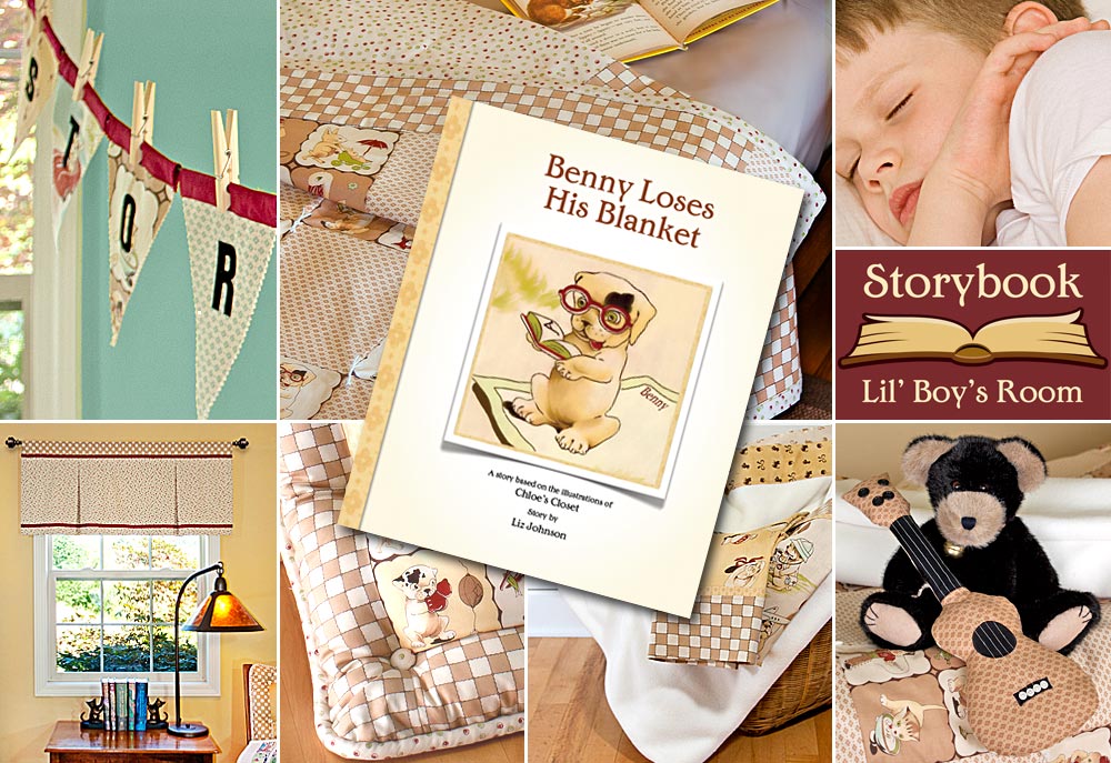 As we roll into the final days before Christmas, we’re taking a moment to step away from our sewing machines to bring you something a little different – something we hope might become a new tradition for the holidays. We wrote a little story and designed a pretty book to go along with the adorable illustrations from Lil’ Rascals by Chole’s Closet – a 2011 fabric collection from Moda that we used a number of years back for a Storybook Bedroom project series (project links below). We offer the book below as a free download. Reading with the children in your life is one of the very best experiences you can give them… and yourself! We hope you enjoy sharing the adventures of Lil’ Benny, who loses his blanket but finds some very special friends.