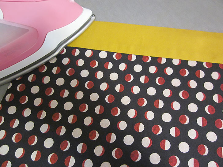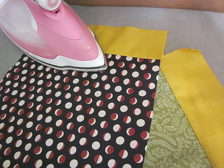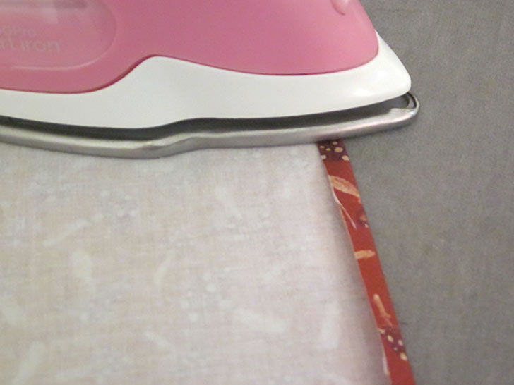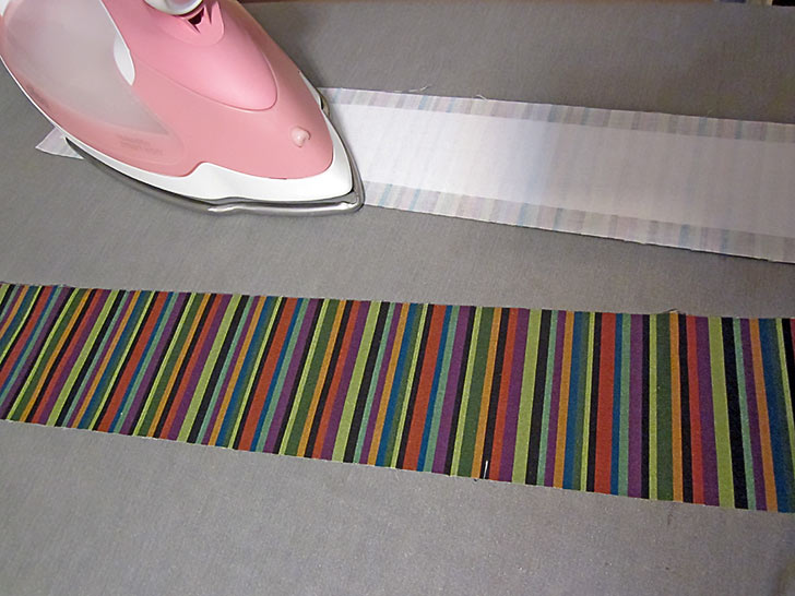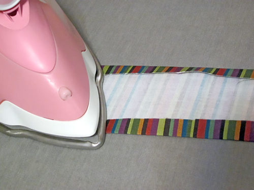 - Along both long sides of each strip, press back the raw edge ½”.