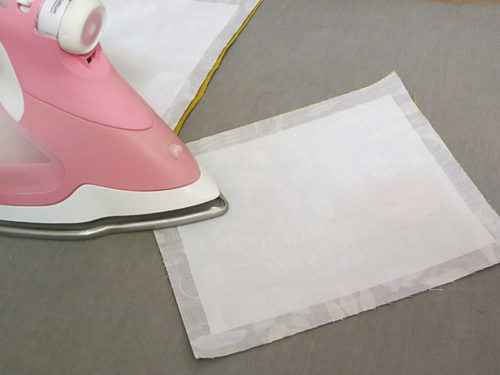 - Center an interfacing panel on the wrong side of each of the pocket fronts. There should be ½” of fabric extending beyond the interfacing on all four sides. Following manufacturer’s instructions, fuse each interfacing panel in place.
