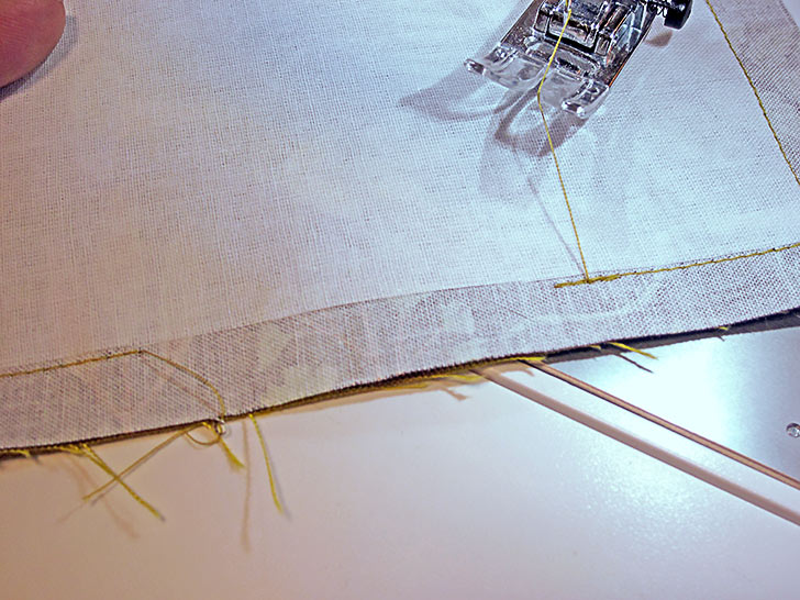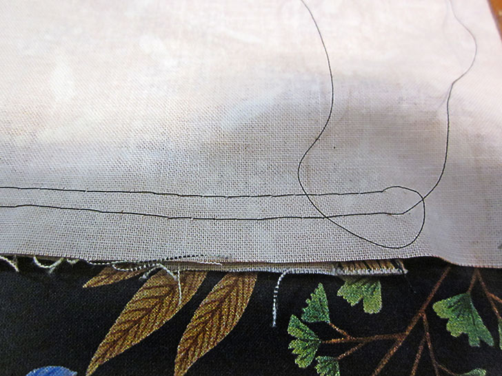- This is a gathering stitch so do not lock the seam at the start or end and leave the thread tails long. Here is a view from the back of the underskirt of the two finished lines of gathering stitches.