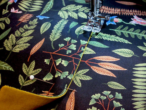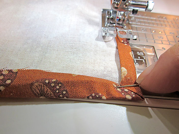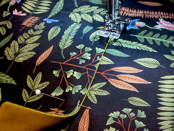 NOTE: If you are new to this classic hemming technique, take a look at our full step-by-step tutorial. It’s a good skill to master and can be used on all kinds of projects that require a narrow hem and tidy corners. - Pin in place and stitch close to the folded edge along both sides and across the bottom of each panel. The top edge remains raw/un-hemmed. As always, make sure you re-thread as needed so your thread in both the top and the bobbin matches the fabric.