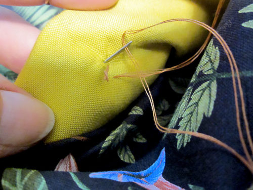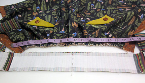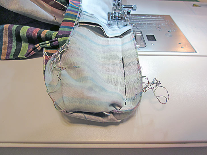 - Stitch all the way across, ending on top of the opposite original start/stop point. Make sure the waist tie ends are pulled out of the way of the seam.