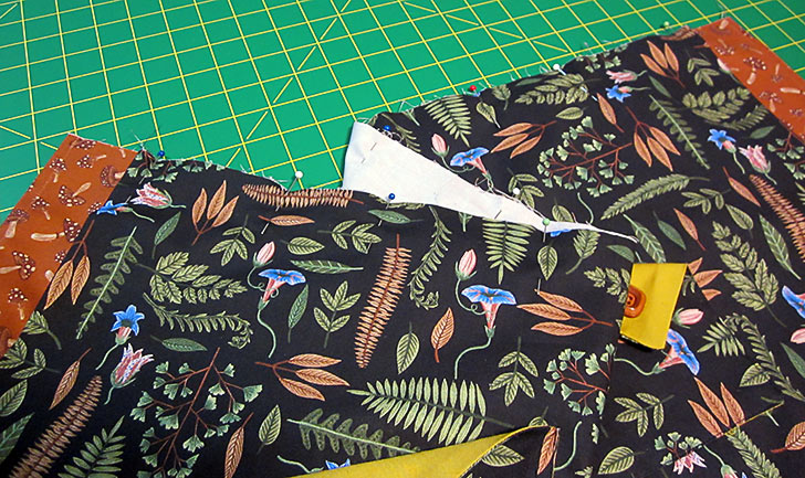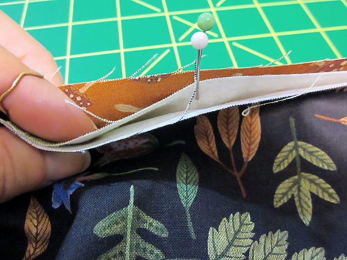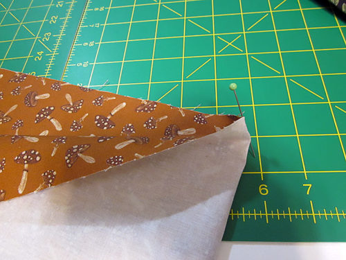 - Unpin the outer corner of each pocket. Fold down this outer corner to create the pocket flap. You are folding at a diagonal. The base of the diagonal is approximately 3½” up from the bottom corner of the pocket.