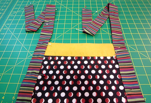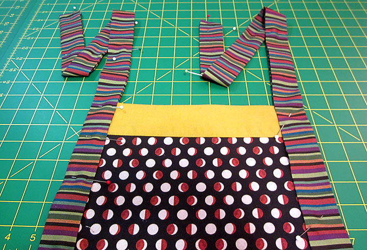 - Pin in place from the bottom of the bib all the way to the top of each tie.