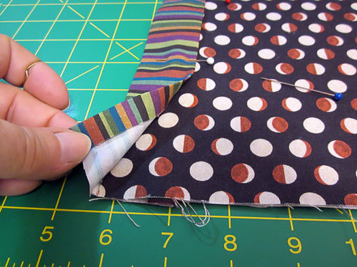 - Put each interfaced pocket front panel right sides together with a pocket lining panel. All four raw edges of the two layers should be flush. Pin in place, leaving an approximate 3” opening along the bottom edge of each layered pair.