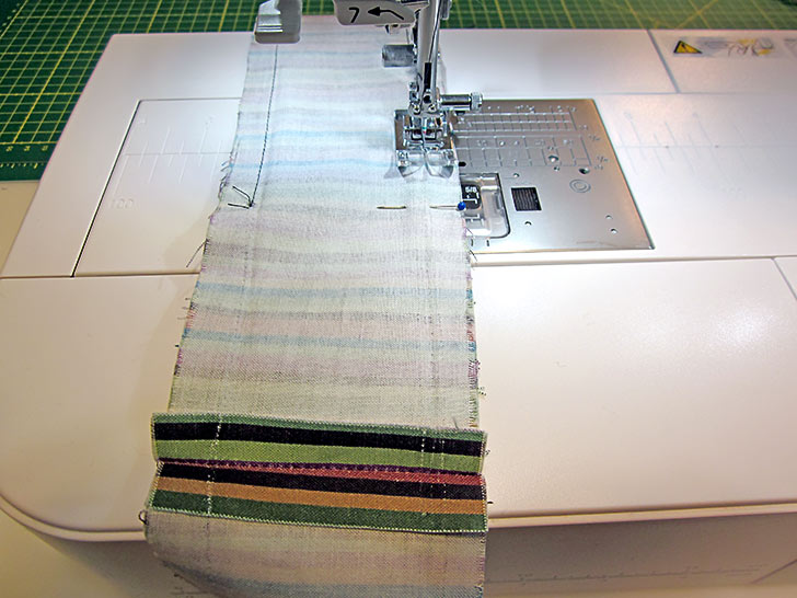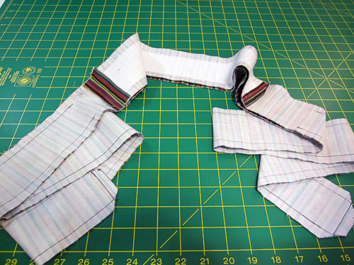 - Press the seam allowances open and flat. You now have two long waistband/tie strips.