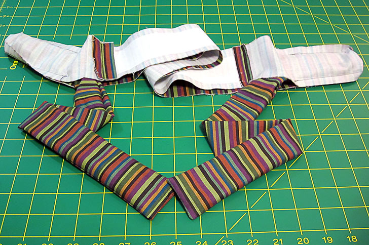 - Turn the ties right side out, but do not attempt to turn the center waistband yet. Press the ties flat.