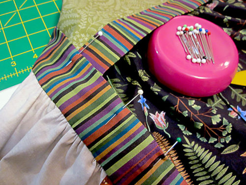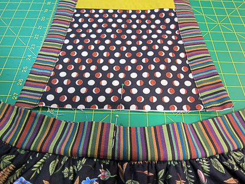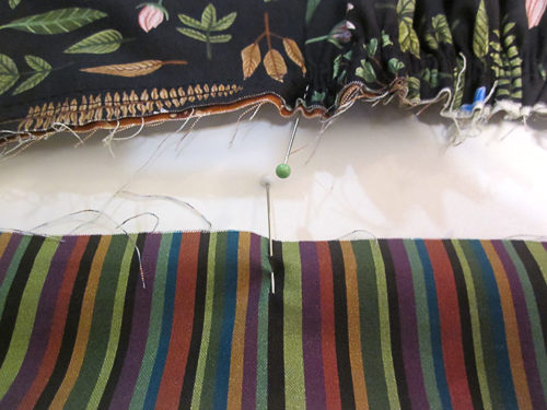 - Pin in place from seam to seam, adjusting the skirt gathers as necessary so the waistband seams are in line with the hemmed outer sides of the underskirt panel.