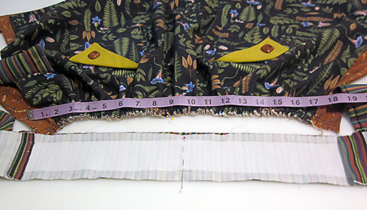 - Pull the gathering stitches along the top until the width of the skirt measures 18” to match the waistband.