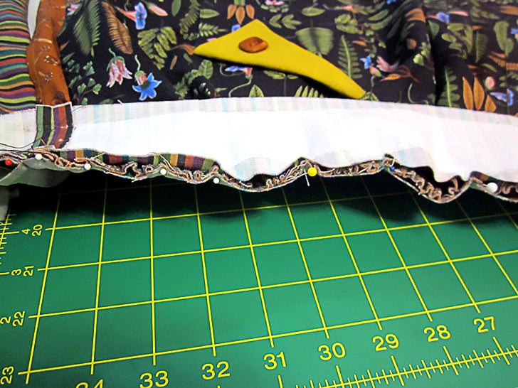 - Pin all the way across through all the layers. There should be approximately 2” of the underskirt showing to either side of the overskirt.
