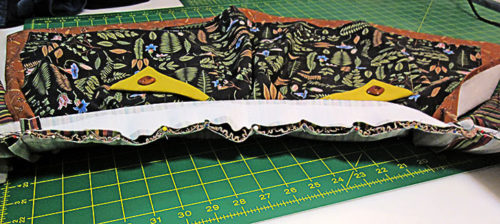 - Turn the overskirt right side out through the open top and press flat, gently pushing out the corners so they are nice and sharp as you did above with a long, blunt tool. Also, take the time to make sure your side and bottom seams run straight and true along the edge – they should not roll to the front or back.
