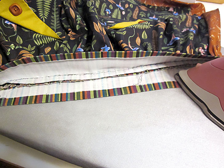 - Press the waistband and the seam allowances up. Then, press in the top raw edges of the waistband opening ½” so they are flush with the sewn tie seams.