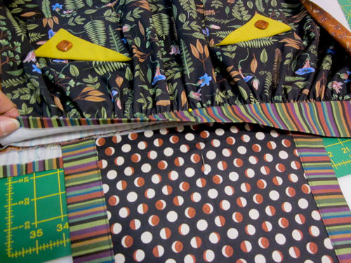 Using the Apron Bib pattern, cut ONE on the fold - From Fabric D (Mushrooms in Rust in our sample), cut ONE 37” wide x 20” high rectangle for the underskirt.