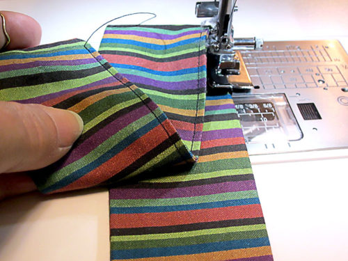- If necessary, re-thread your machine with thread to best match the tie fabric in the top and the bobbin. Re-set for the same slightly lengthened stitch you’ve used above for edgestitghing.