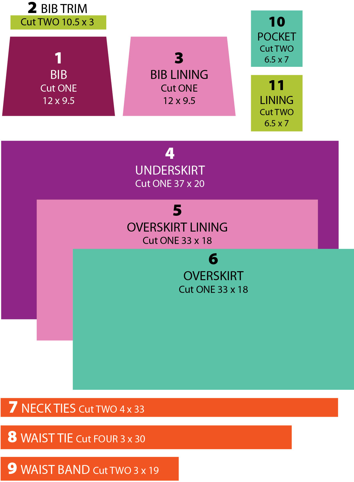 TWO 4” x 33” strips for the bib side trim/neck ties