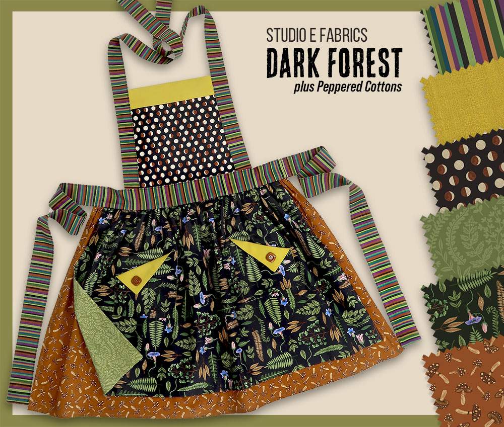 Our main sample apron was originally made in Dark Forest by Melissa Wang for Studio E Fabrics. Botanical style images of ferns and leaves are rendered in rich, earthy tones. There’s a bit whimsy in the mix as well with playful tossed mushrooms and a multi-colored stripe. We also added a coordinating blender from the Peppered Cottons collection by Pepper Cory, also for Studio E.