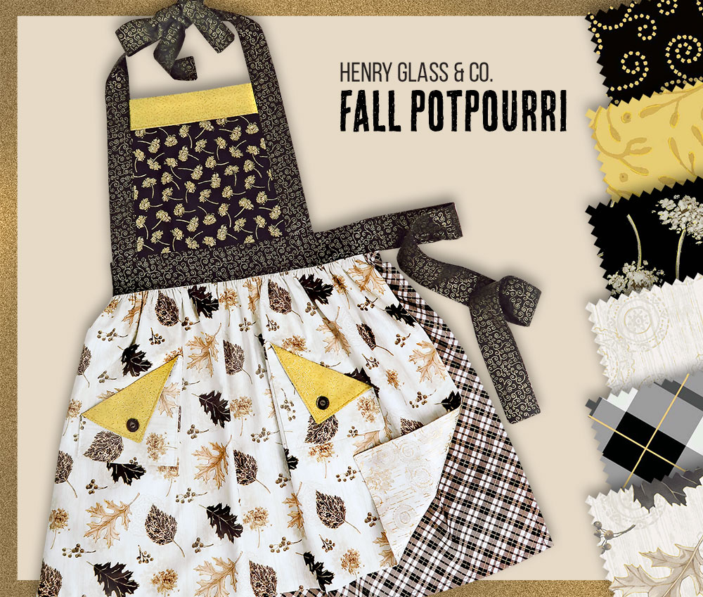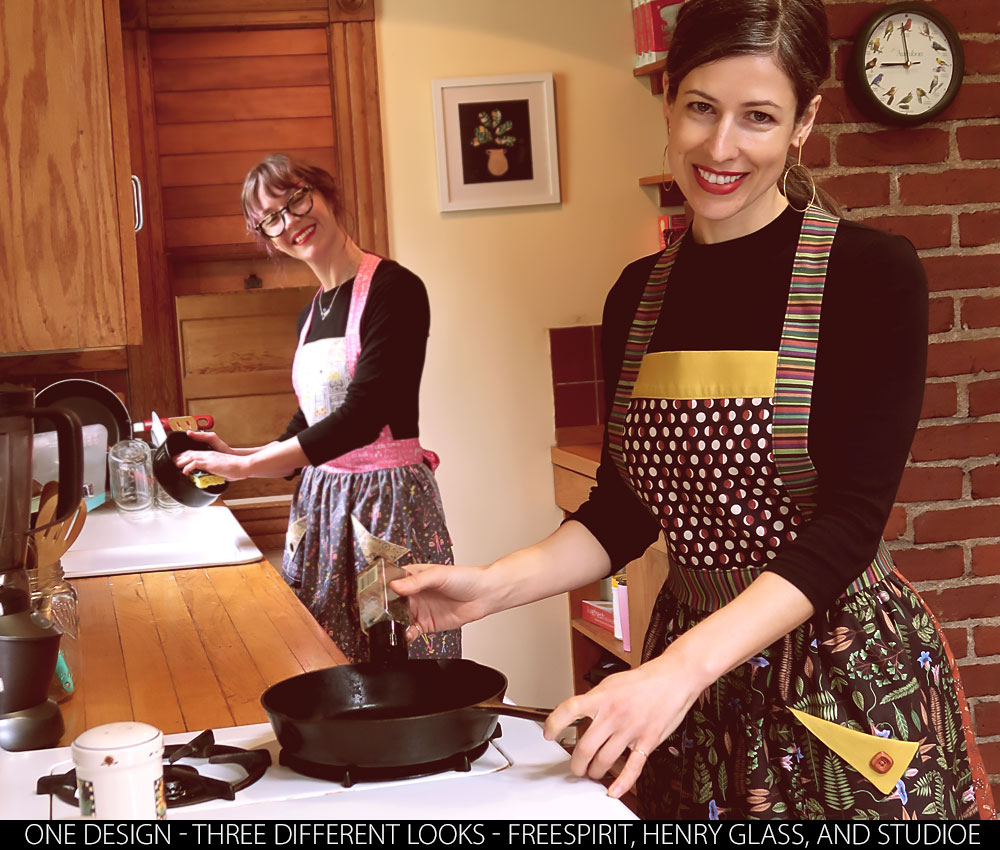 Our custom apron design uses SIX coordinated prints. We originally executed this design in three different collections from within the Jaftex family of fabrics: FreeSpirit Fabrics, Henry Glass & Co., Inc., and Studio E Fabrics.