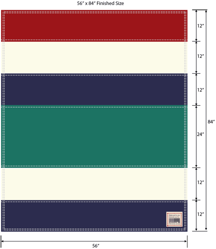 NOTE: The yardage listed below requires some precise cutting. If you are unsure are your cutting ability, bump the ¾ yard cuts to a full yard and the ½ yard cut to ¾ yard. We used and recommend four colors, two stripes each from two of the colors and one stripe each from the other two colors. See the drawing above for our color and width recommendations. Click for our color selections from Fabric.com.