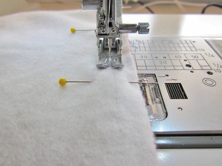 - Working from top to bottom, and following our diagram above, pin the first panel (red) to the second panel (white), matching the center pin points and the raw edges.
