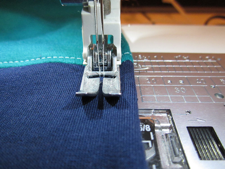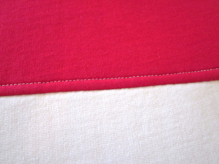 - Because the knit doesn’t ravel, we used a single fold hem and saved ourselves a little time with a twin needle.
