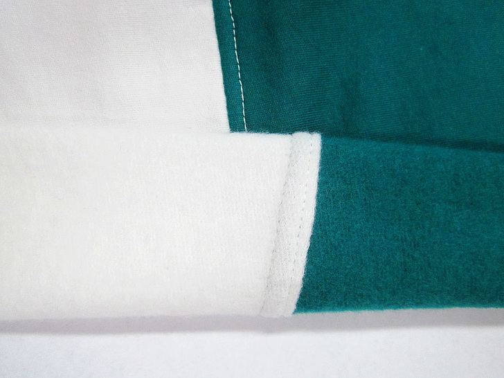 - Pin the extra-wide fourth panel (teal) to the remaining raw edge of the third panel (navy). Stitch together, then create a flat felled seam to finish.